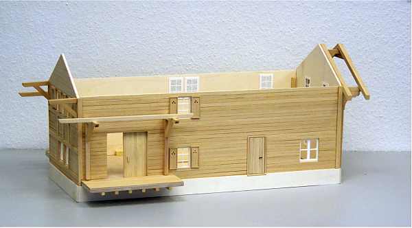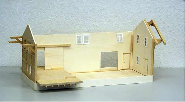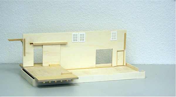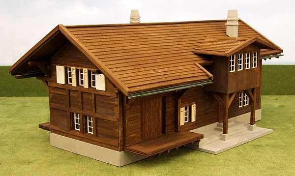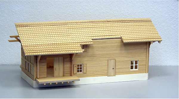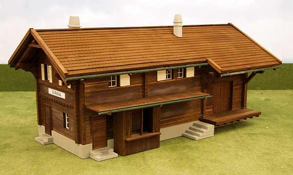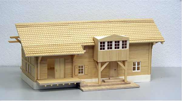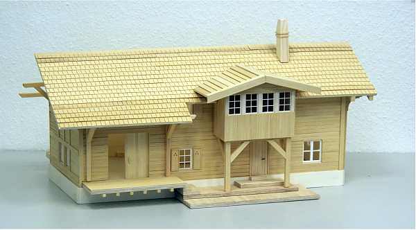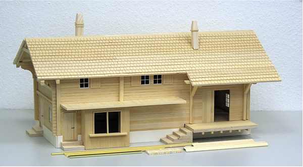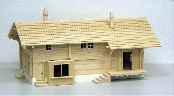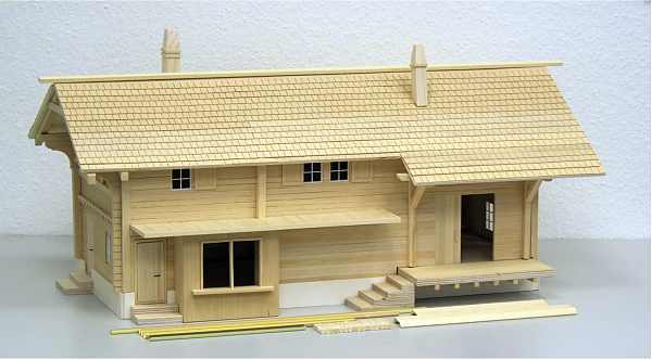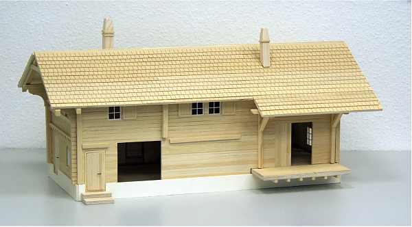 Dieser Bausatz ist nach Originalplänen aus dem Jahre 1909 der Rhätischen Bahn entstanden. Er ist, genau wie das Original, ganz aus Holz gebaut. Easy-Bausatz sehr leicht zu montieren! Er besteht aus nur 20 vorgefertigten Teilen sowie einigen Leisten für das Dach und Halterungen für die Dachrinnen und hat Kunsttoffenster. Die einzelnen Module wie zum Beispiel die Dachhälften, Seitenteile, Vorder- und Hinterseite sind vorgefertigt und brauchen nur noch zusammengesteckt und miteinander verklebt (verleimt) werden. Der Link zeigt auf Bilder des farblich unbehandelten Bausatzes.